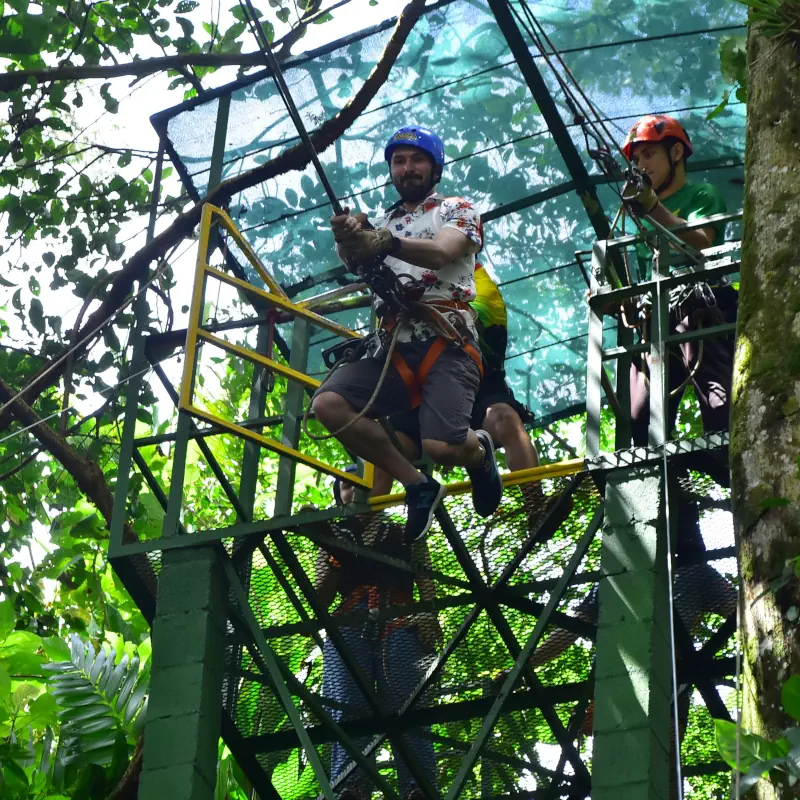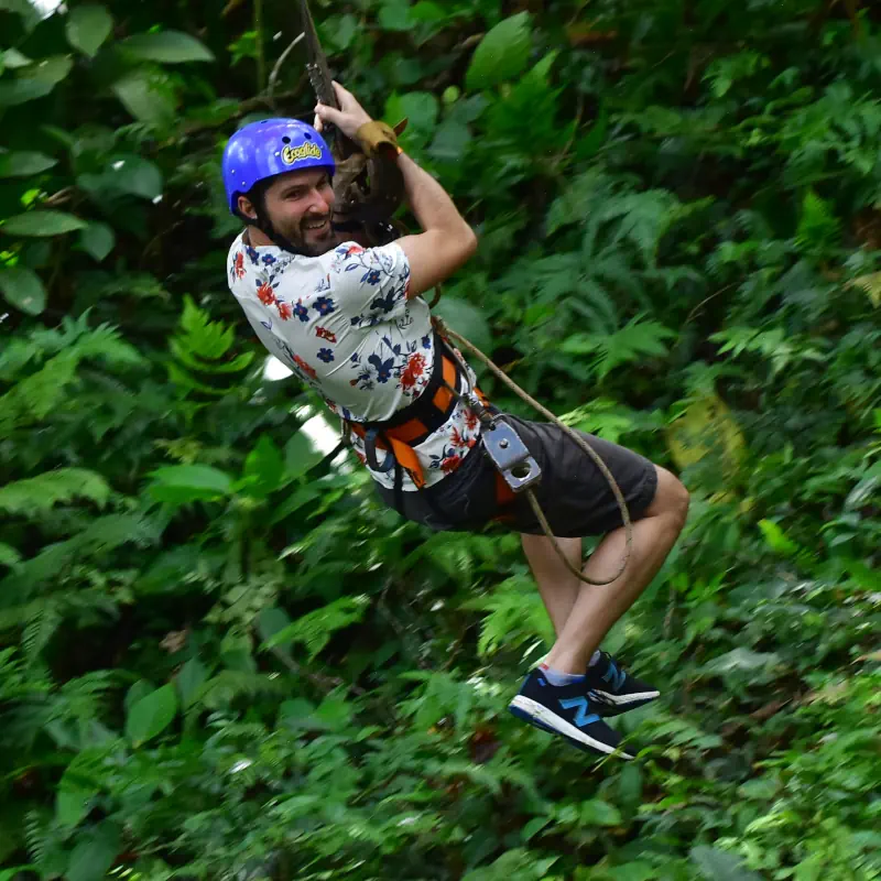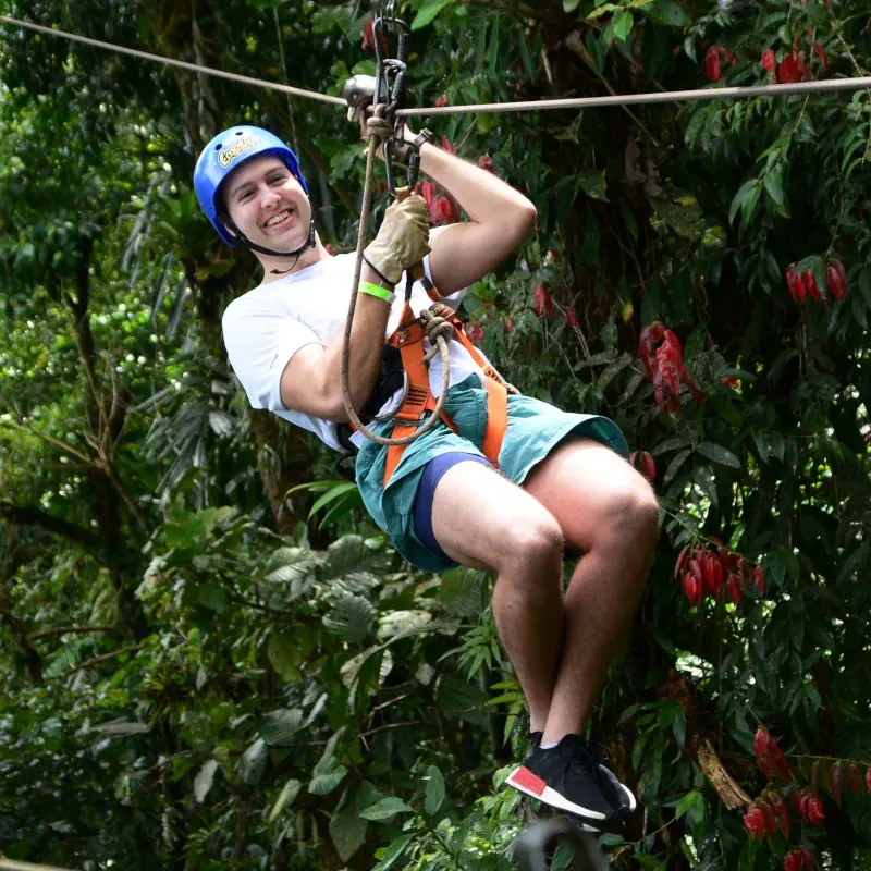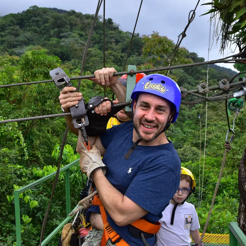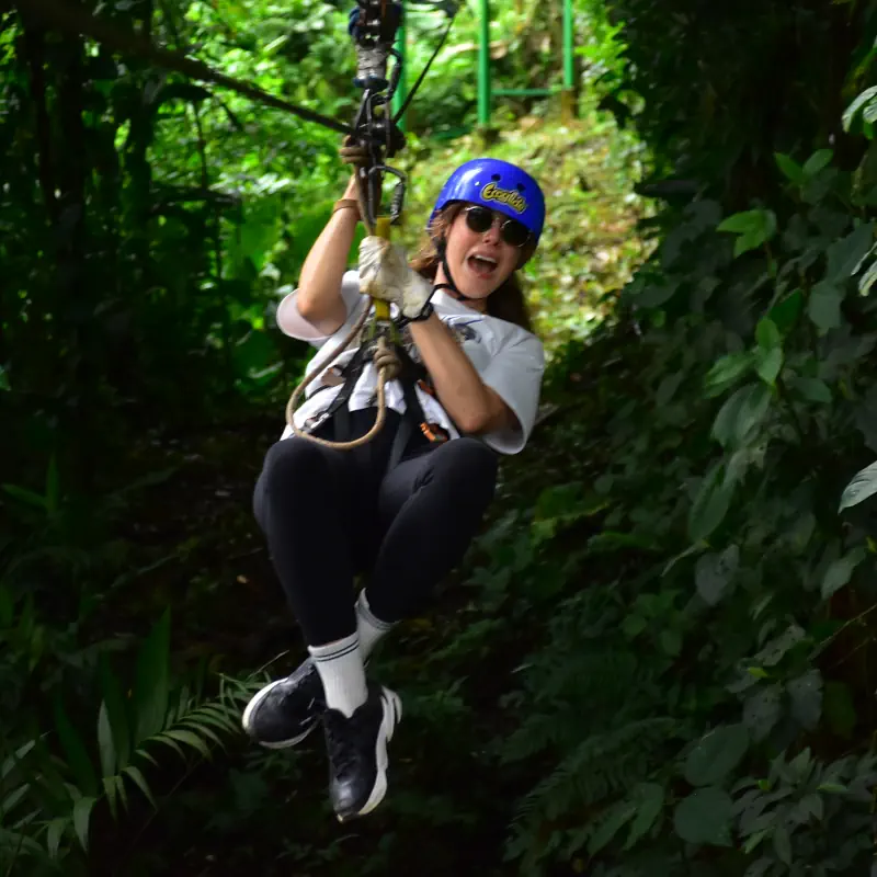 Fly through the rainforest canopy on the Canopy Zipline Tour with Tarzan Swing at Ecoglide Arenal Park. Glide across 11 ziplines, cross a hanging bridge, and leap into adventure on the Tarzan Swing, all while enjoying panoramic views of Arenal Volcano. Safe, family-friendly, and unforgettable.