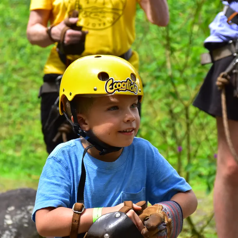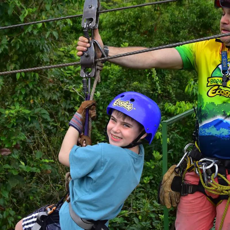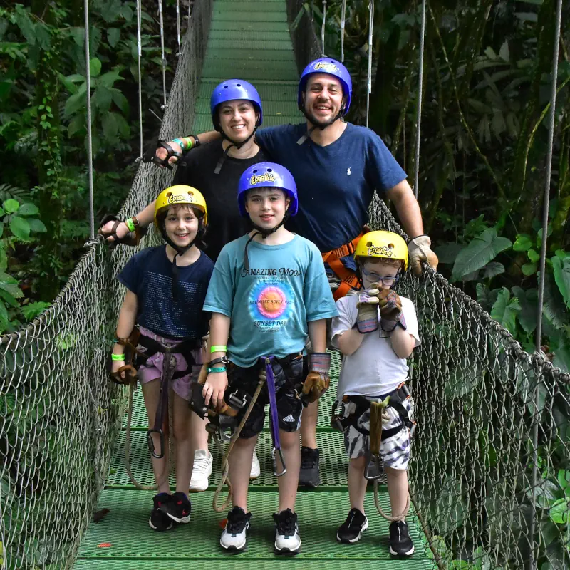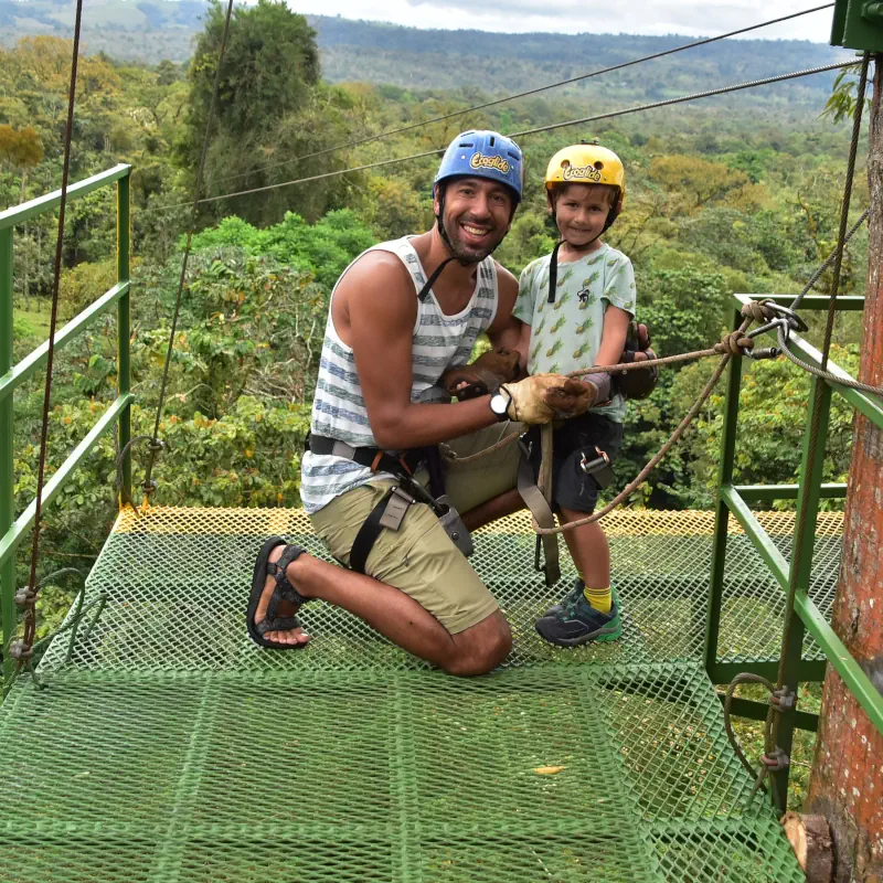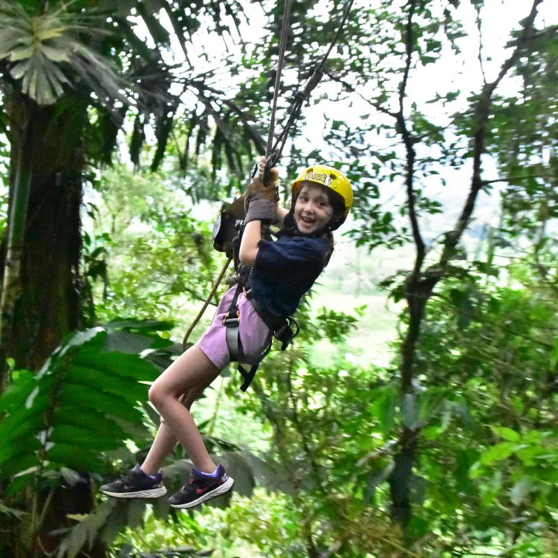 Fly through the rainforest canopy on the Canopy Zipline Tour with Tarzan Swing at Ecoglide Arenal Park. Glide across 11 ziplines, cross a hanging bridge, and leap into adventure on the Tarzan Swing, all while enjoying panoramic views of Arenal Volcano. Safe, family-friendly, and unforgettable.